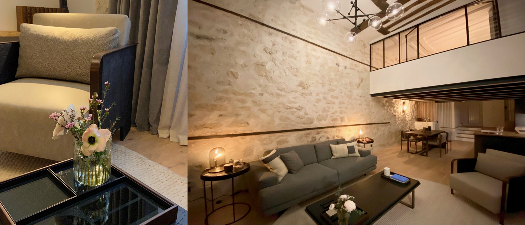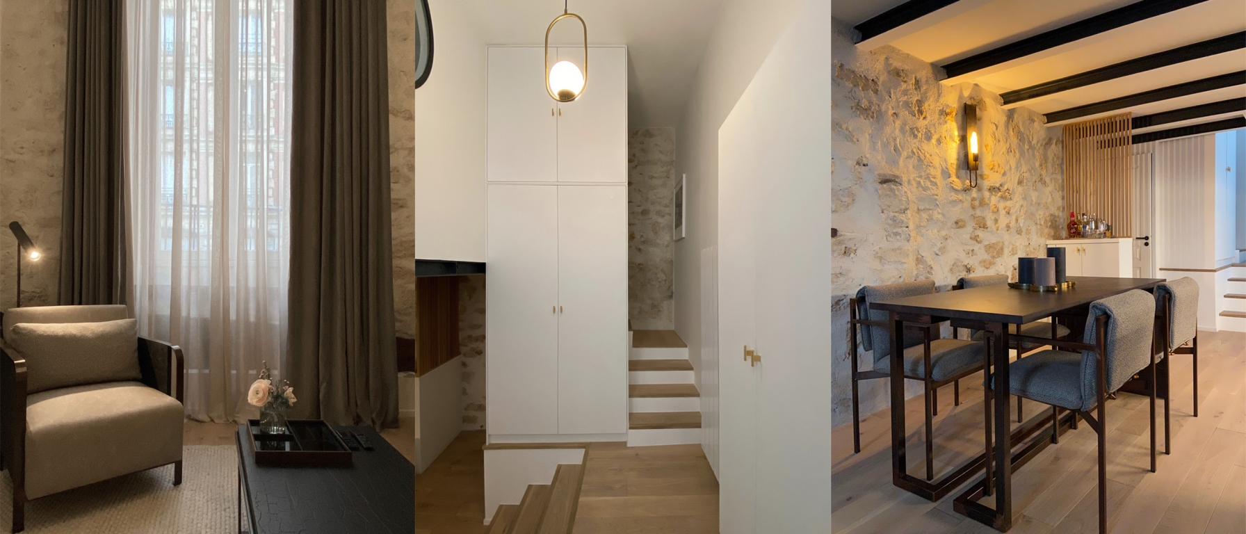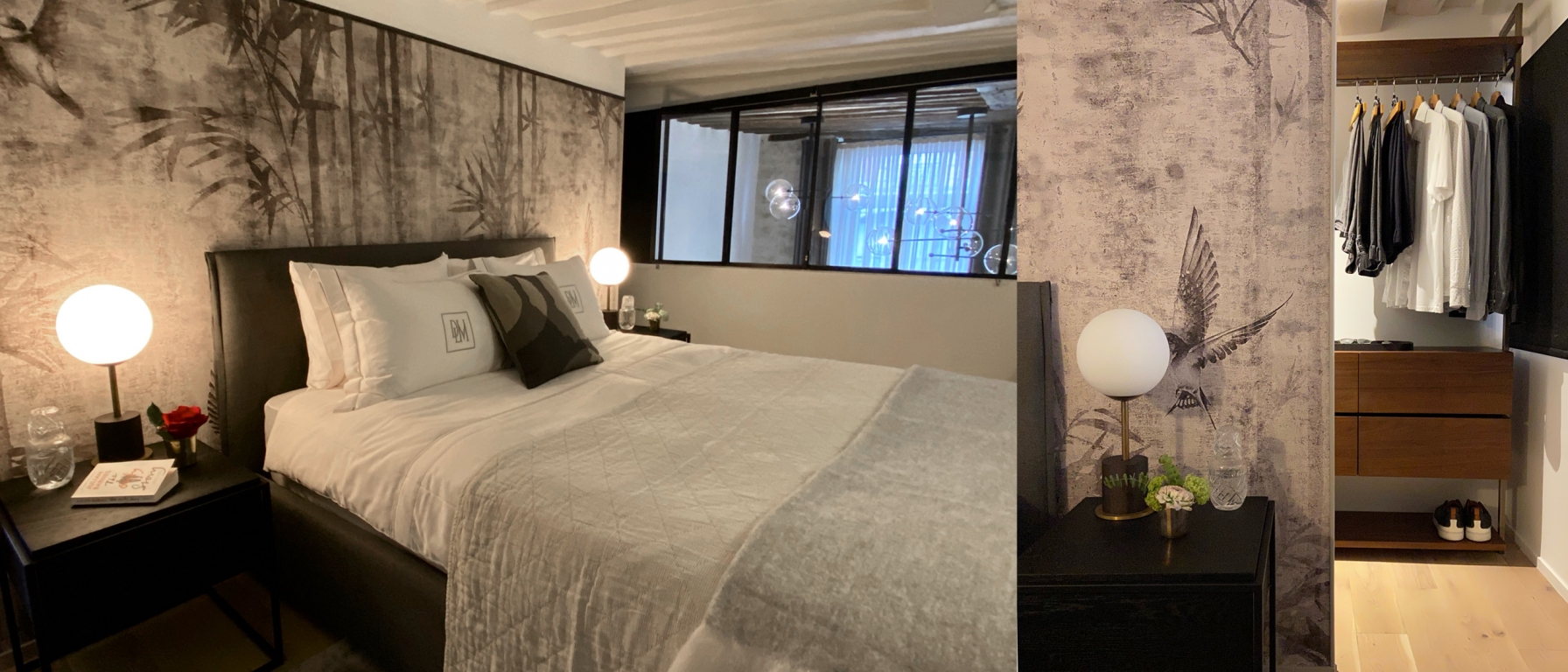 Notre appartement est situé au deuxième étage avec un accès privé par un escalier dans la cour à l'arrière du bâtiment. Vous entrez dans l'espace de 65m2 sur un niveau qui comprend le hall d'entrée. De là, vous pouvez descendre quelques marches pour accéder à la salle de séjour et sa cuisine ouverte avec des plafonds de 4.5 mètre de hauteur et une fenêtre géante donnant sur la rue de Turenne. Ou bien vous pouvez monter un demi-escalier pour atteindre la chambre à coucher avec sa salle de bains et son dressing. La chambre est dotée de fenêtres intérieures donnant sur le salon.