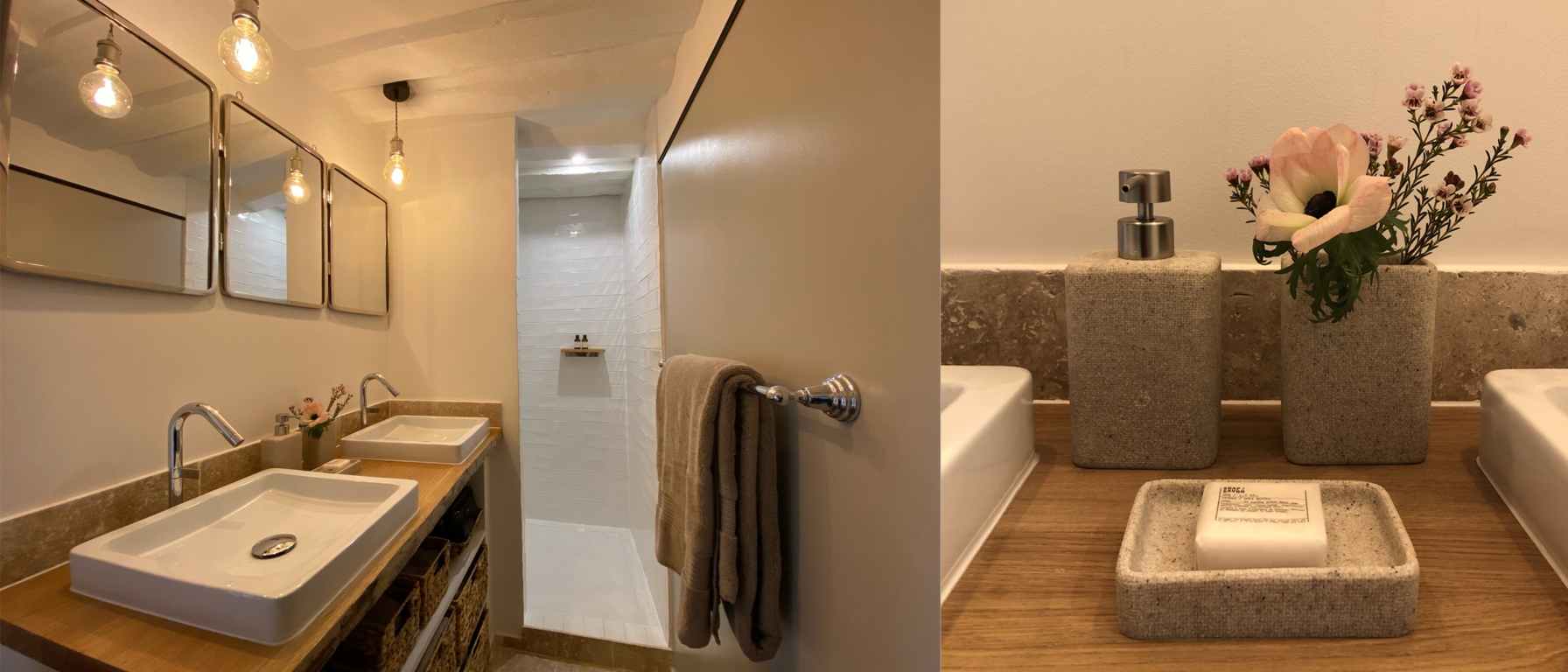 Caractéristiques de la salle de bains : Douche, double lavabo, serviettes de bain et peignoirs, sèche-cheveux, chauffe-serviettes, produits de soins de bain complémentaires. A noter: Les toilettes sont aparts sur le niveau principal et non pas dans la salle de bains.