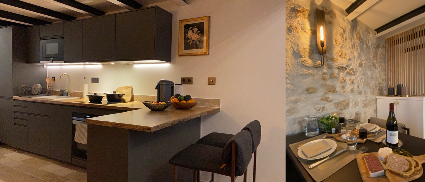 Caractéristiques architecturales : Murs en pierres naturelles apparentes, sols en parquet, poutres en bois apparentes et entretoises murales en fonte. La mezzanine est ancrée au-dessus de la cuisine par des poutres d'acier industrielles exposées, ce qui confère à l'espace un style industriel tout en préservant la nature / structure médiévale du bâtiment.